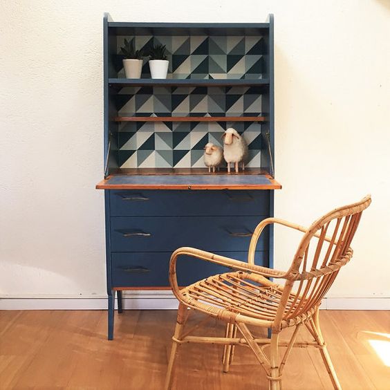 Pour un côté vintage/chic contemporain vous opterez pour le petit meuble chiné en brocante, ou bien le petit secrétaire de mamie que vous pouvez poncer, repeindre ou revernir. Une manière de s’impliquer et de s’approprier un peu plus son espace de travail, puis entre nous, c’est aussi bon pour la planète !